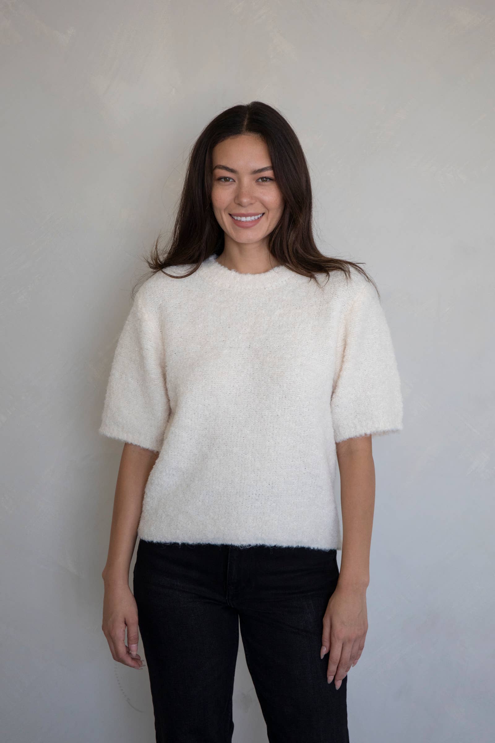 Wrap yourself in cozy comfort with the Anita Soft Boucle Pullover! This adorable short-sleeve sweater top features a luxuriously soft boucle knit that's perfect for layering or wearing solo. The relaxed pullover silhouette offers effortless style, while the textured fabric adds visual interest to any outfit. Whether you're heading out for a casual day or snuggling up indoors, this sweet knit top brings warmth and charm to your wardrobe