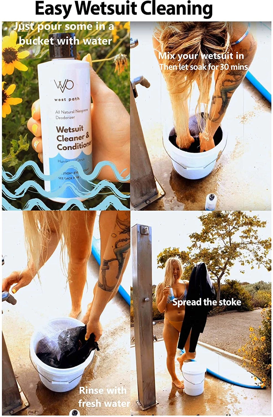 Easy to use: mix a generous pour into a bucket of water; mix in your wetsuit or neoprene, then let it sit for 30 minutes; rinse with freshwater and enjoy!